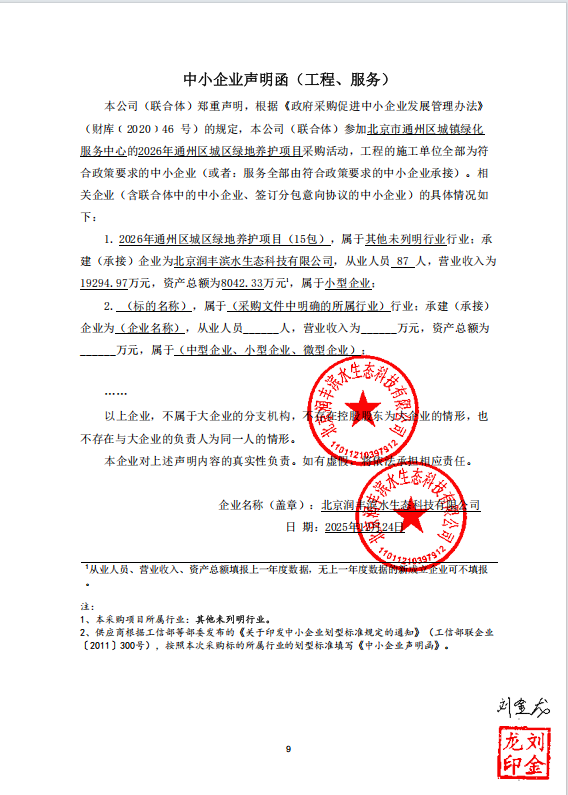 | 北京润丰滨水生态科技有限公司 | * | ***.******万元 | ***.******万元 | ****年通州区城区绿地养护项目(**包)养护内容包括但不限于:浇灌、修剪、 中耕除草、施肥、 有害生物防治、更新、调整、补植、植物防护、 树体损伤处理、复壮、 绿地保洁、景观水体管理、 安全保护、档案管理、绿地内附属设施管理、绿地防火、园林废弃物收集运输、协助采购人开展临时任务 |