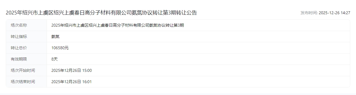 2025年绍兴市上虞区绍兴上虞春日高分子材料有限公司氨氮协议转让第3期转让公告