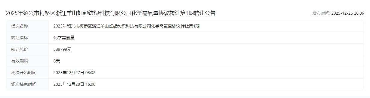 2025年绍兴市柯桥区浙江羊山虹起纺织科技有限公司化学需氧量协议转让第1期转让公告