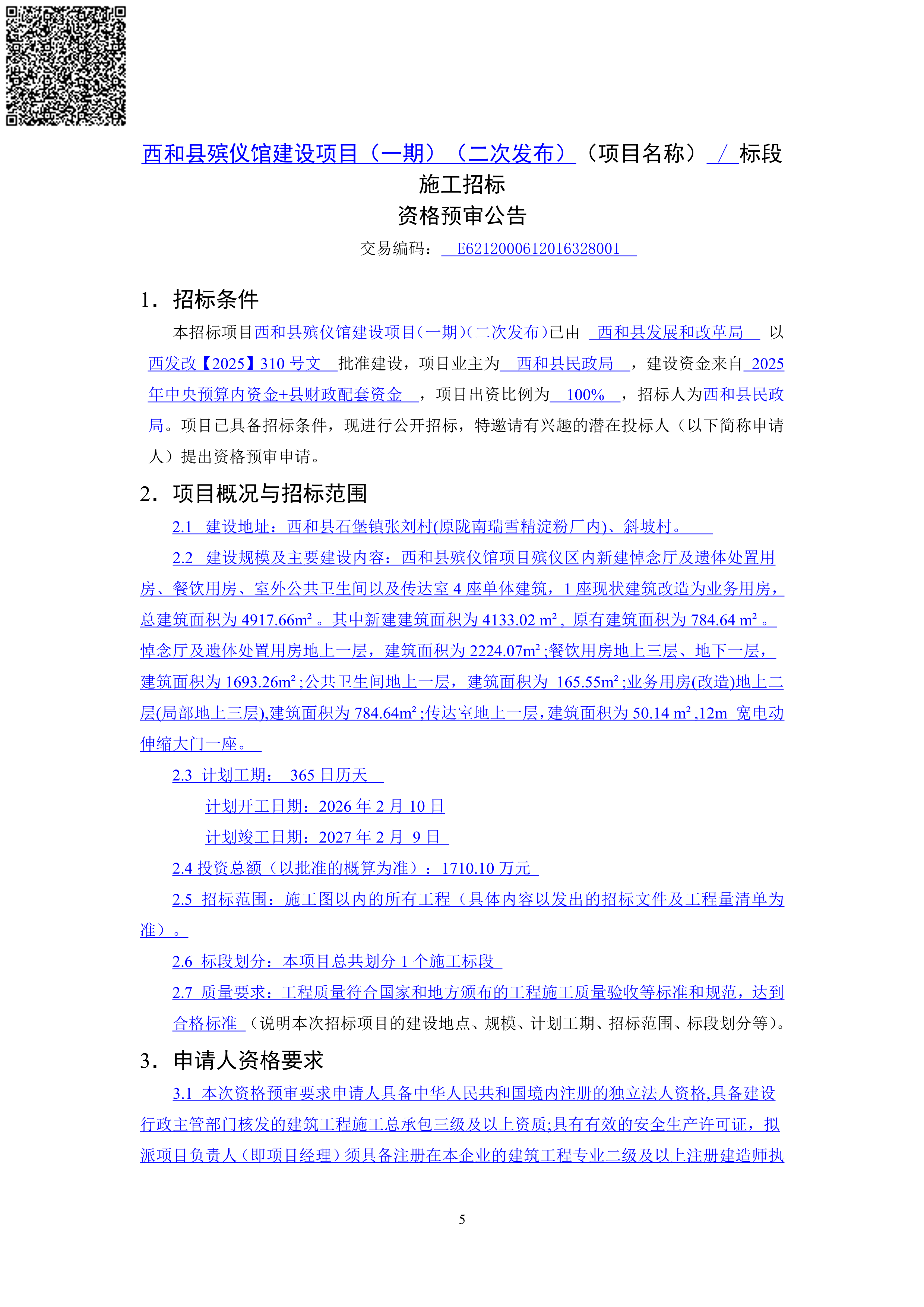 西和县殡仪馆建设项目(一期)(二次发布)施工招标资格预审公告