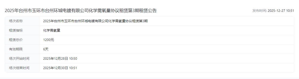 环城电镀有限公司化学需氧量协议租赁第3期租赁公告交易公告