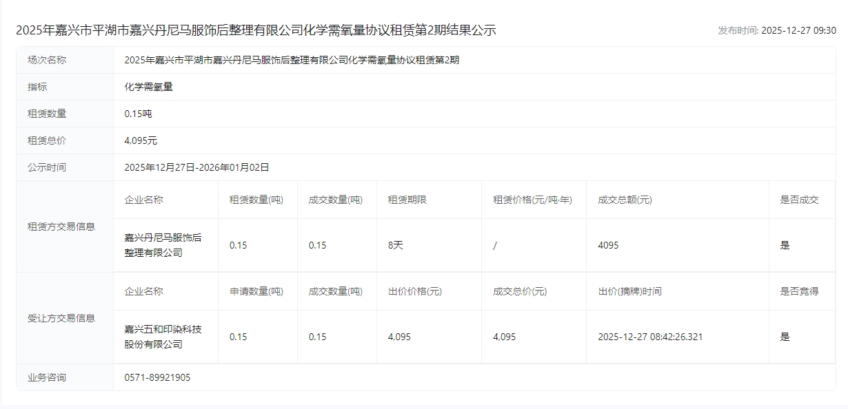 2025年嘉兴市平湖市嘉兴丹尼马服饰后整理有限公司化学需氧量协议租赁第2期结果公示成交公示