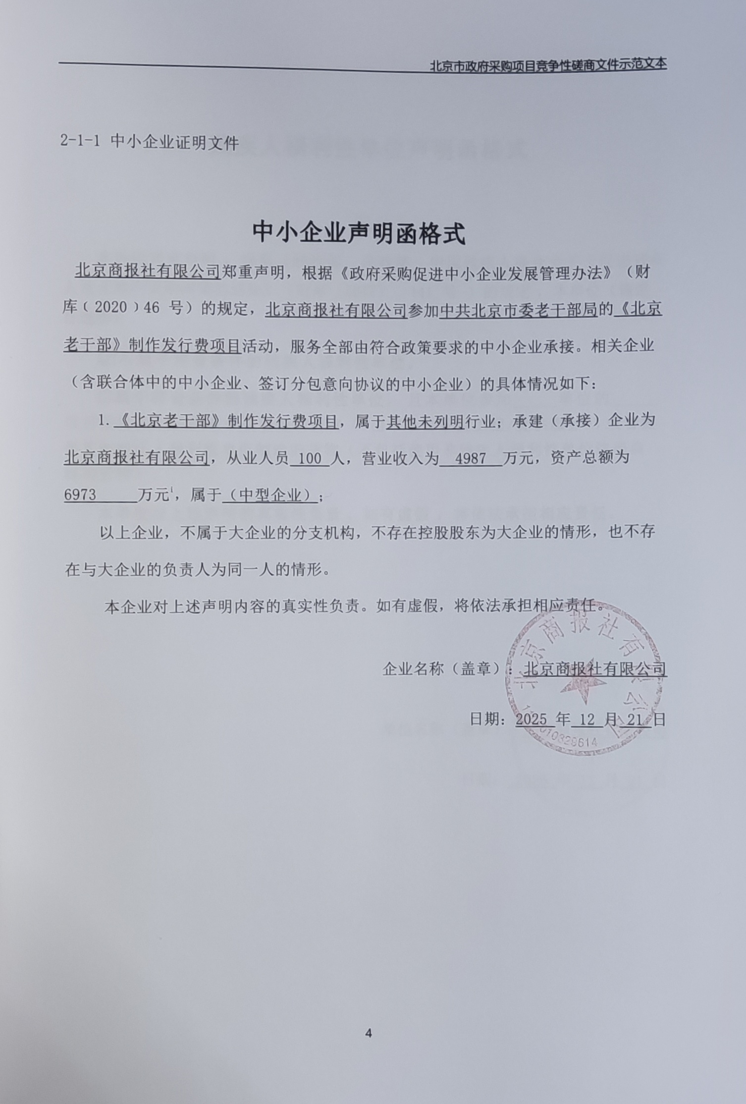 | 北京商报社有限公司 | ** | **.***万元 | ***.***万元 | 《北京老干部》是中共北京市委老干部局主管主办的面向北京市老干部的内部资料。《北京老干部》制作分发,设计排版、制作,****年度**期《北京老干部》,每期**页,每期*****本,按照要求完成投递。为全市老干部读者营造一个温馨快乐的精神家园,积极传递党和政府的声音,打造重要的宣传舆论阵地。采购要求:按照采购人合同要求设计排版、提交成品,按采购人提供的发送地址及份数要求,委托专业公司进行发送,于制作完成后**日内送达。成品中不出现暴力、色情等违法内容,不侵犯任何第三方的知识产权或隐私权、肖像权等合法权益。对采购人提供的一切资料及其他商业秘密履行保密义务,未经采购人许可不得用于其他媒体报道,不得用于任何商业行为。详见技术需求。 |