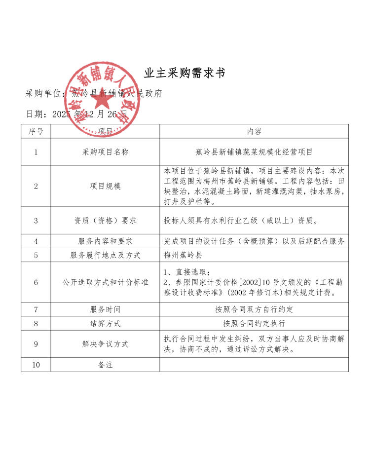 蕉岭县新铺镇蔬菜规模化经营项目采购公告