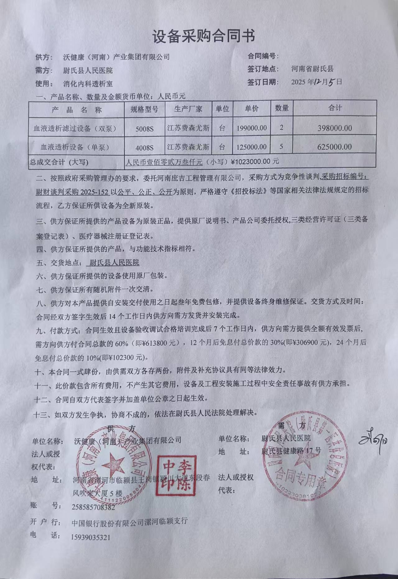 尉氏县人民医院血液透析滤过设备项目