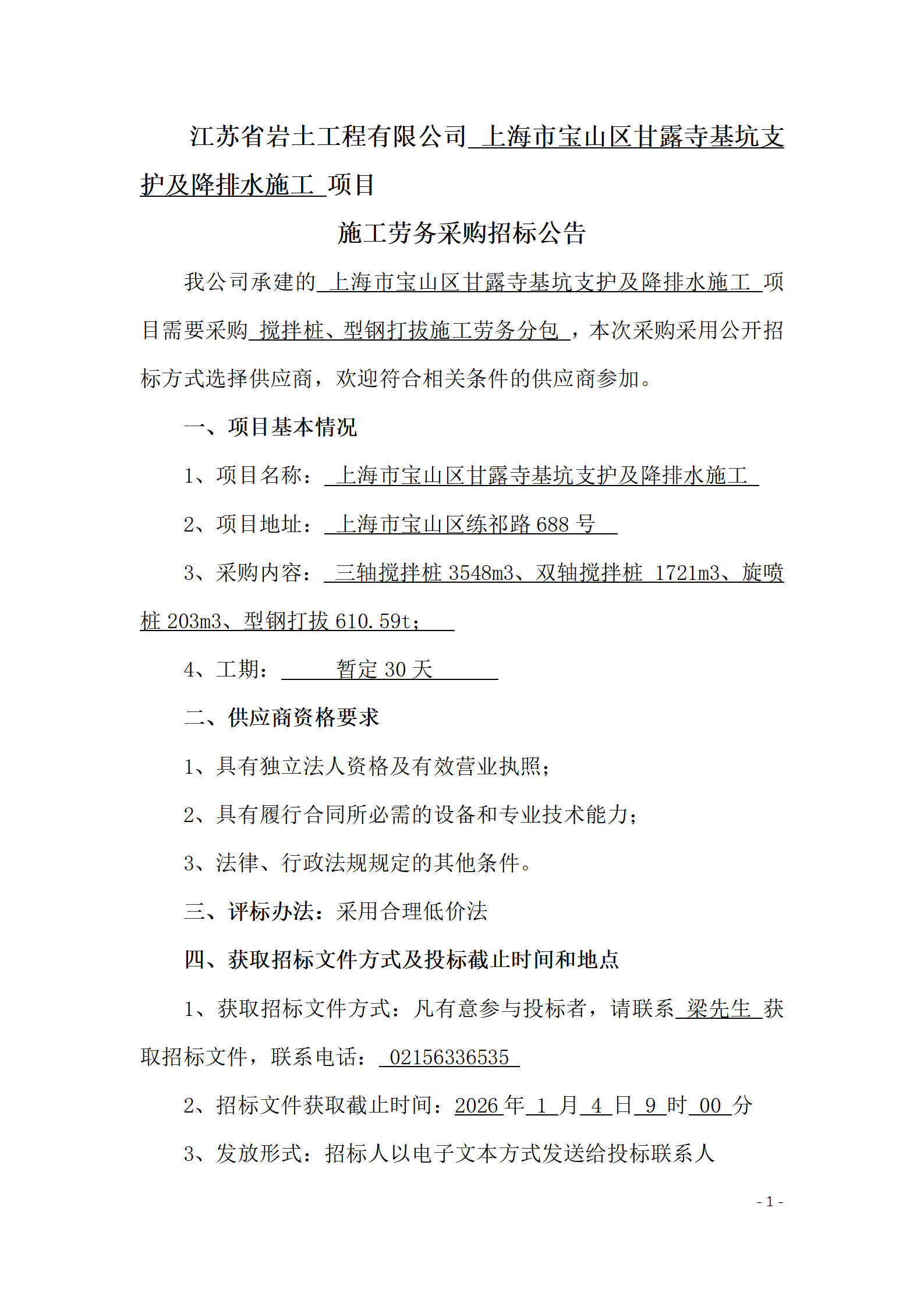 江苏省岩土工程有限公司 上海市宝山区甘露寺基坑支护及降排水施工项目施工劳务采购招标公告