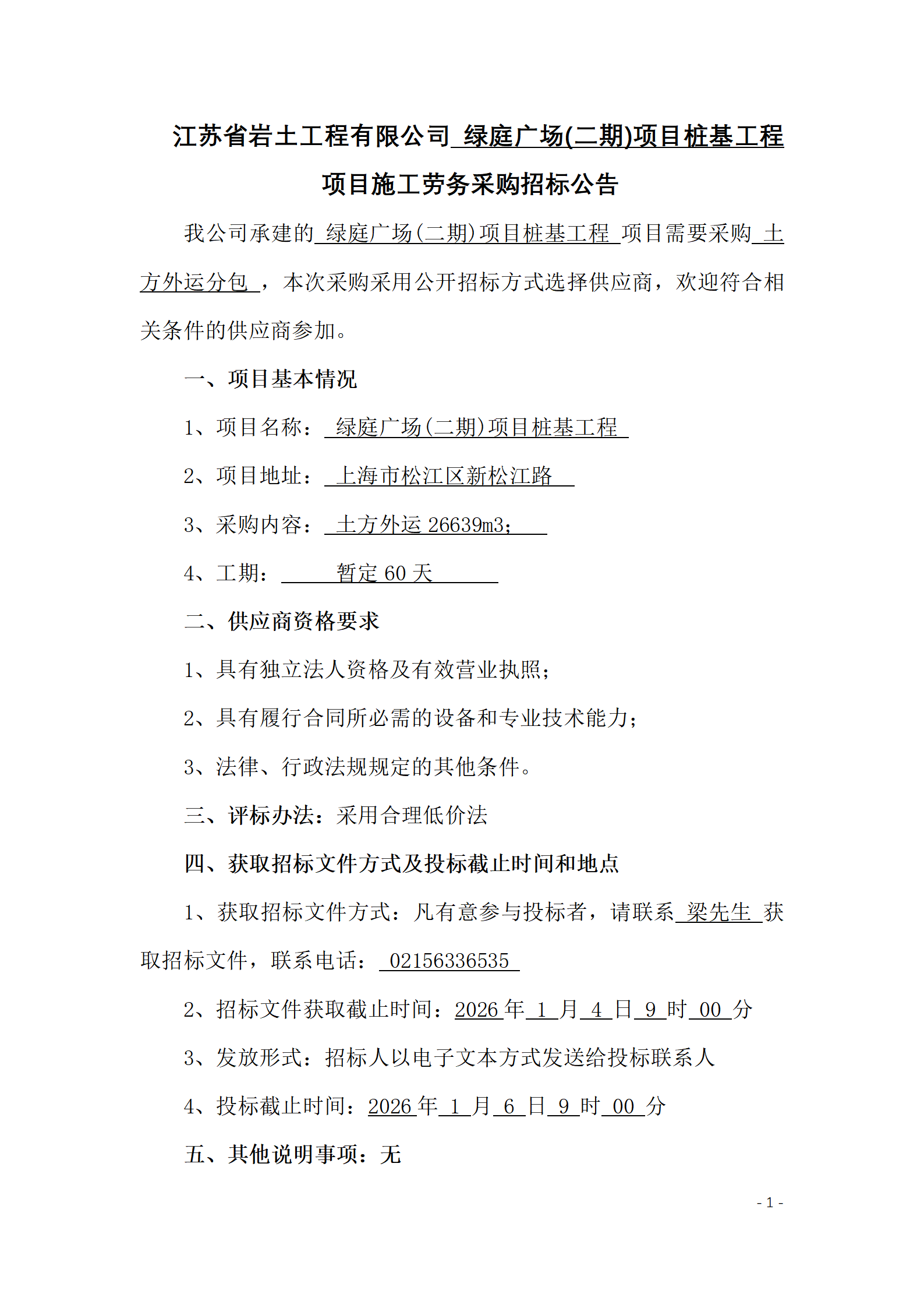 江苏省岩土工程有限公司绿庭广场(二期)项目桩基工程项目施工劳务采购招标公告