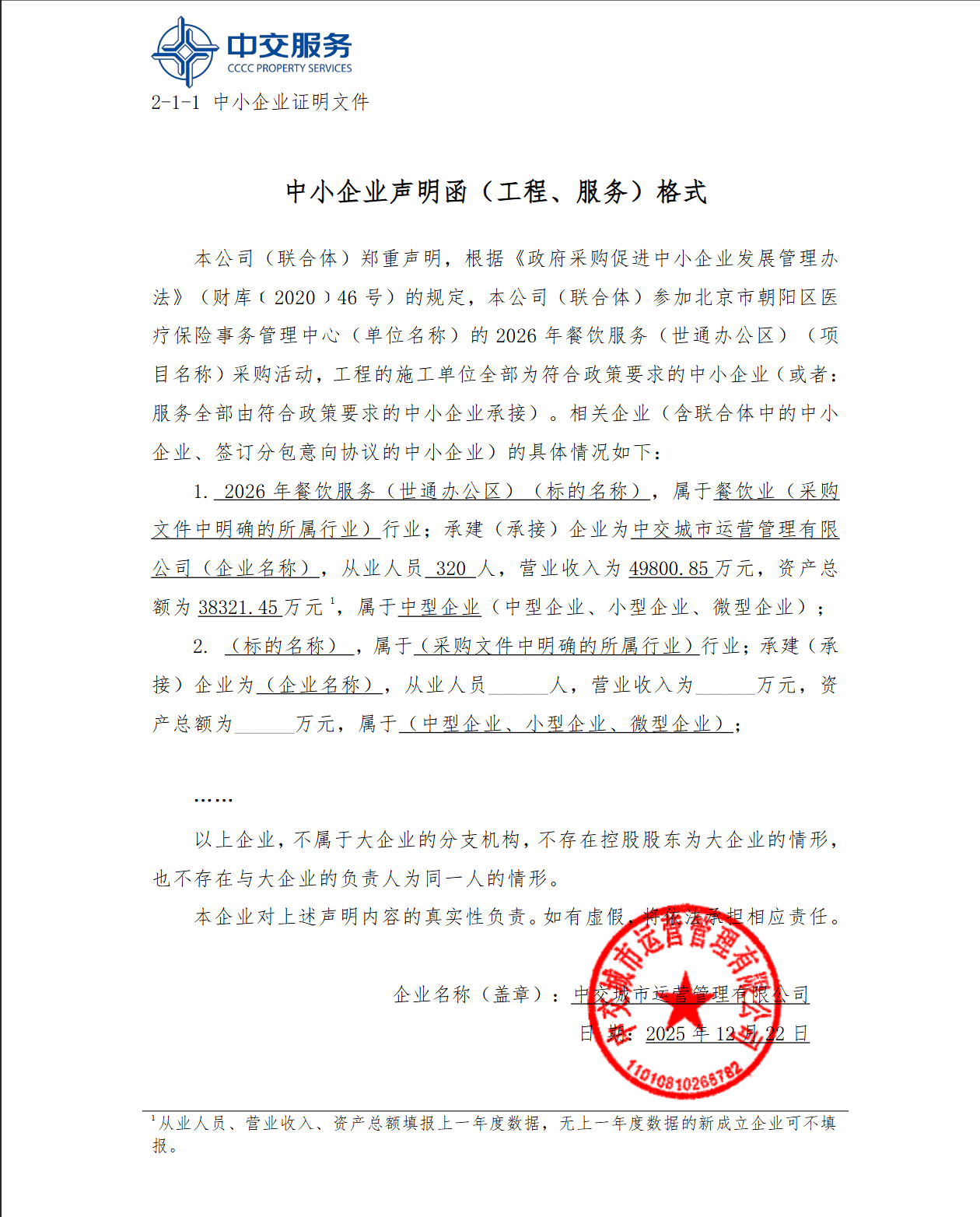 | 中交城市运营管理有限公司 | * | ***.*****万元 | ***.*****万元 | 为北京市朝阳区医疗保险事务管理中心提供餐饮服务,合同履行期限为****年*月*日*****年**月**日。 |