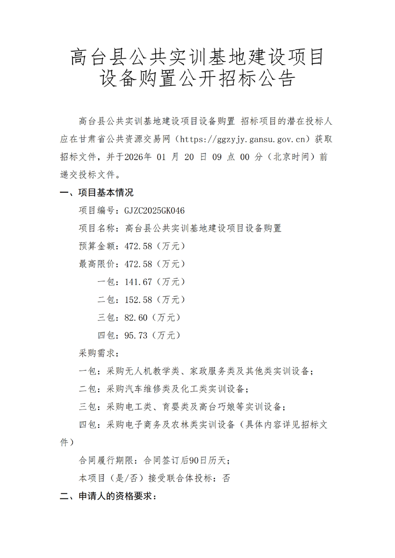 高台县公共实训基地建设项目设备购置公开招标公告采购/资审公告