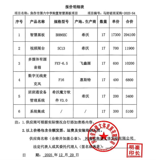 | *、采购项目名称:焦作市第六中学购置智慧黑板项目 | |||||||||||||||||||||||||||||||
