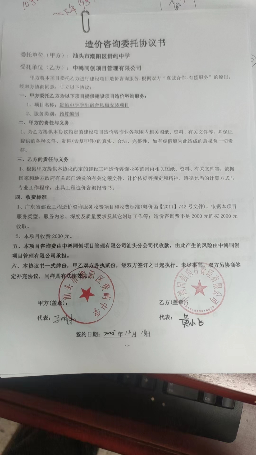 贵屿中学学生宿舍风扇安装项目合同公开