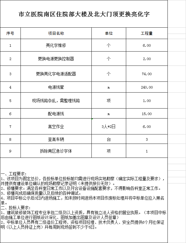 宿州市立医院南区住院部大楼及周边亮话字维修项目询比价公告