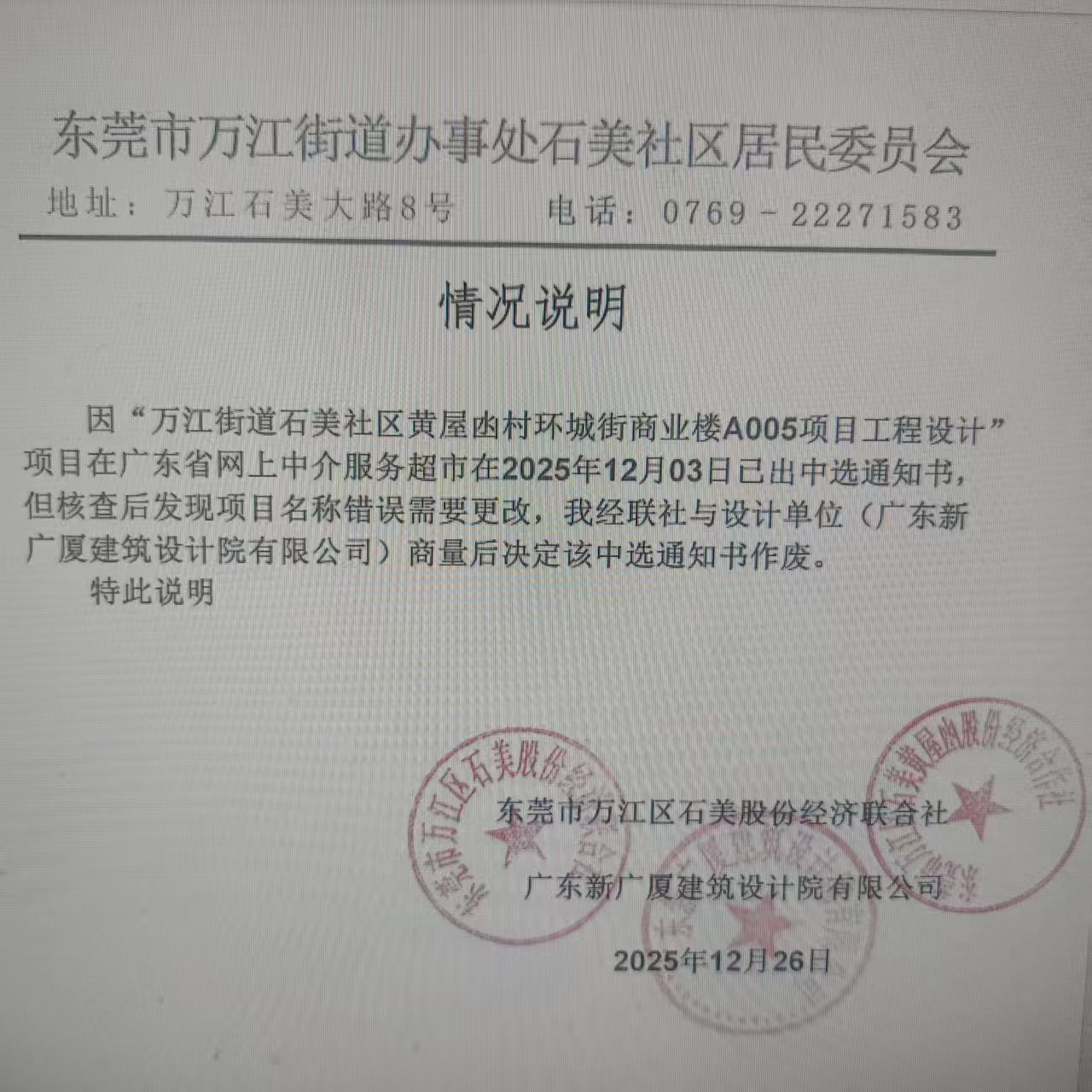 万江街道石美社区黄屋凼村环城街商业楼A005项目工程设计采购失败项目公示