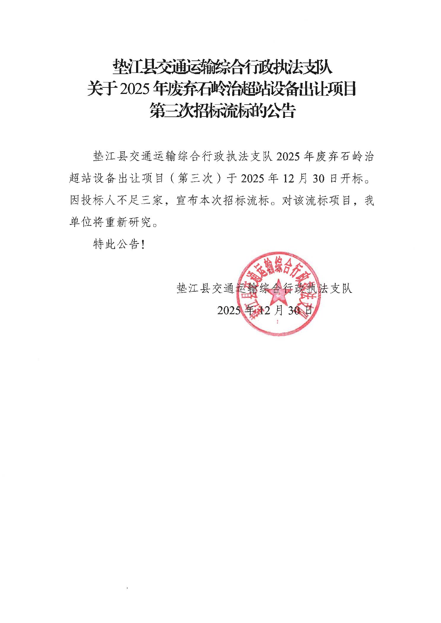 垫江县交通运输综合行政执法支队2025年废弃石岭治超站设备出让项目第三次招标流标的公告