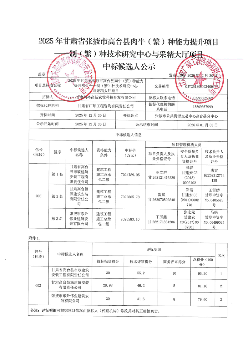 [高台县]2025年甘肃省张掖市高台县肉牛(繁)种能力提升项目——制(繁)种技术研究中心与采精大厅项目中标候选人公示