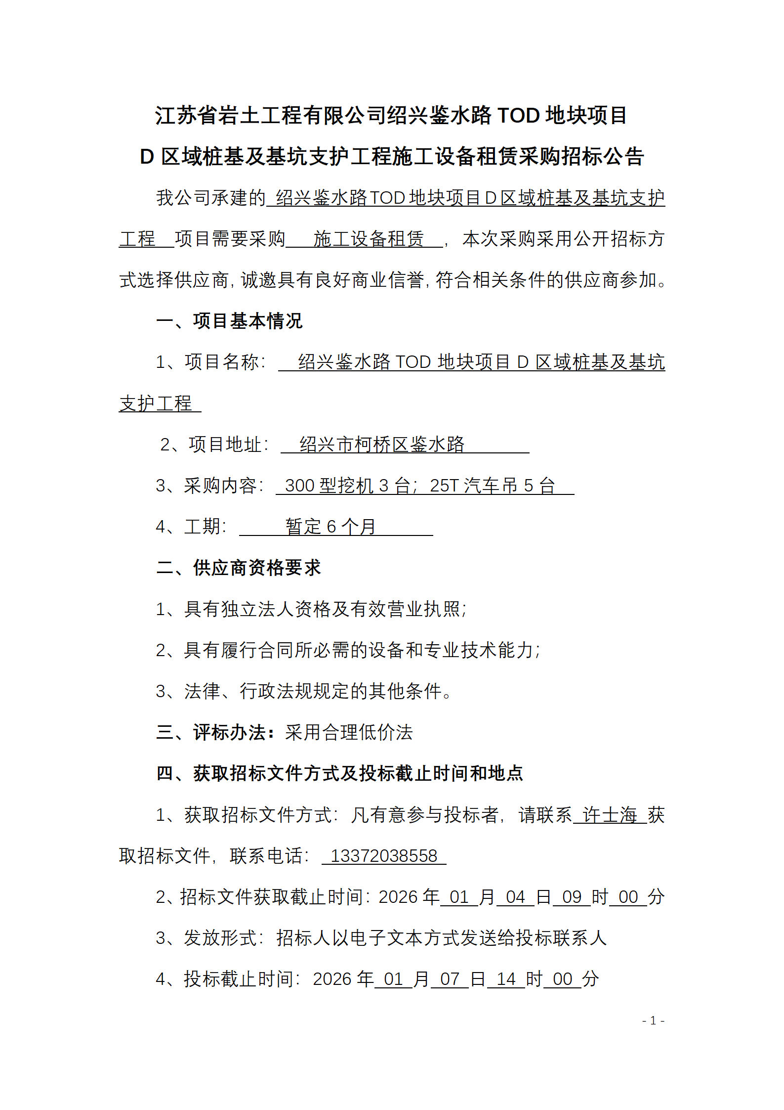 江苏省岩土工程有限公司绍兴鉴水路TOD地块项目D区域桩基及基坑支护工程施工设备租赁采购招标公告