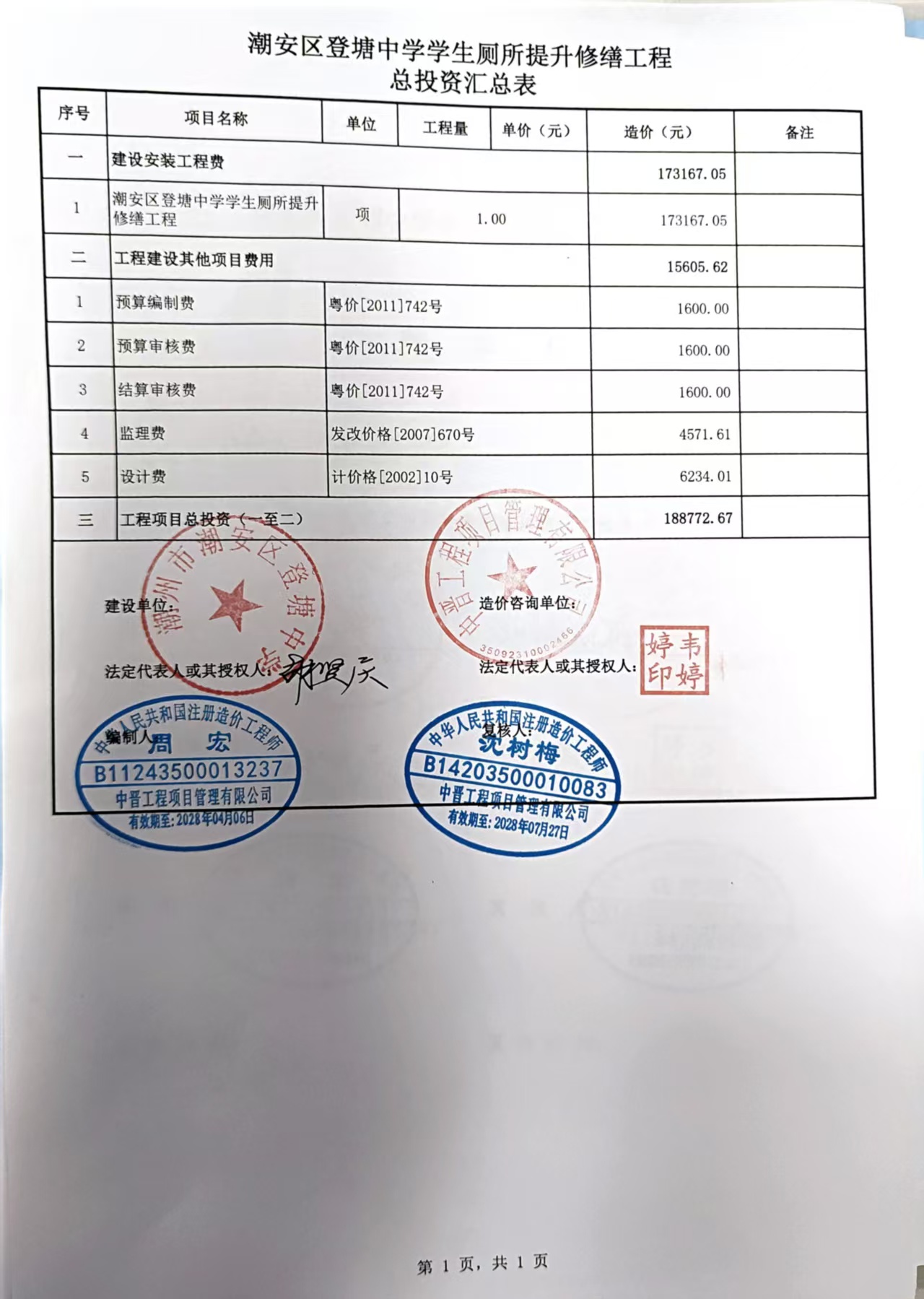 就潮安区登塘中学学生厕所提升修缮工程*的预算审核,并出具相关报告。项目位于潮安区登塘镇郑岗村郑岗山旁,现对学生厕所进行提升改造。厕所为长*米,宽*.**米,高*.**米单层建筑,包含内部配套。预计****年*月进行改造。预算投入资金******.**元(包含其他项目费用)。