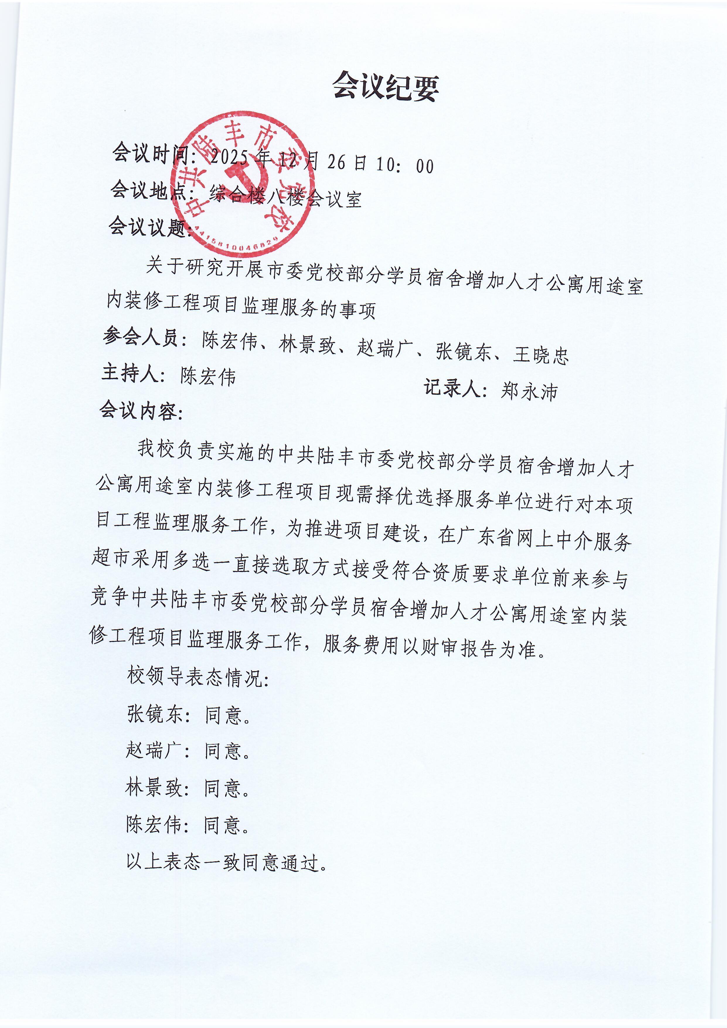 中共陆丰市委党校部分学员宿舍增加人才公寓用途室内装修工程项目监理服务采购公告
