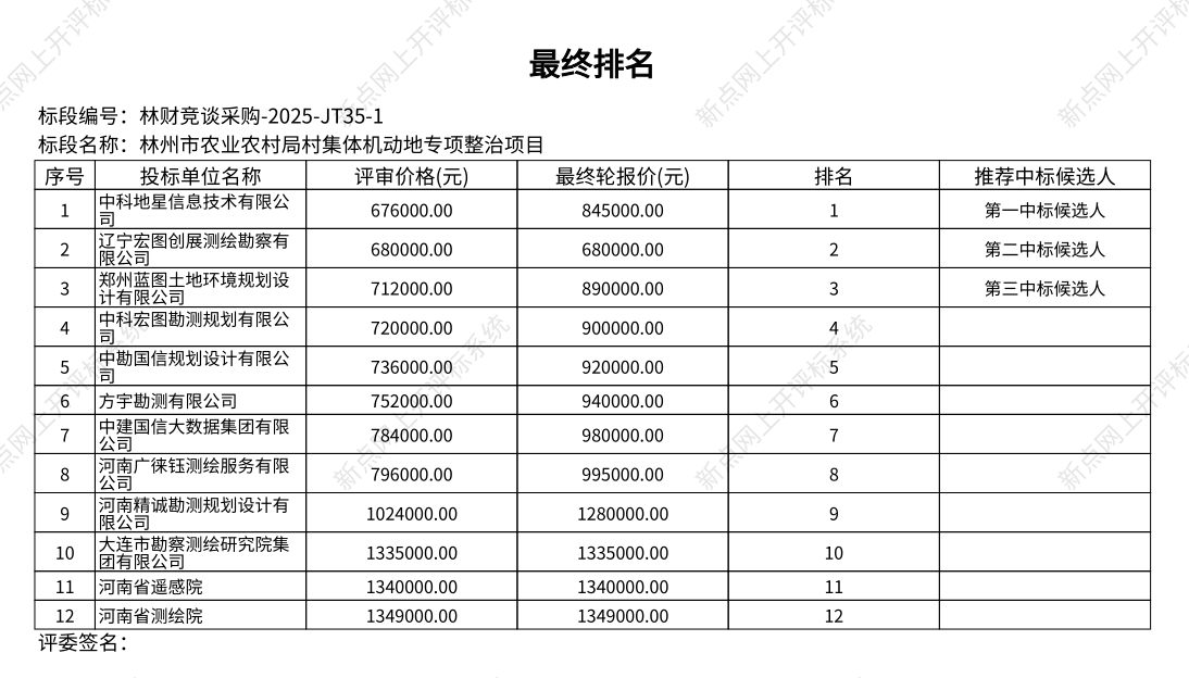 | 评标结果如下: 第一成交候选供应商:中科地星信息技术有限公司,最终报价:******.**元(评审价******.**元); 第二成交候选供应商:辽宁宏图创展测绘勘察有限公司,最终报价:******.**元(评审价******.**元); 第三成交候选供应商:郑州蓝图土地环境规划设计有限公司,最终报价:******.**元(评审价******.**元); 其他供应商:中科宏图勘测规划有限公司******.**元、中勘国信规划设计有限公司******.**元、方宇勘测有限公司******.**元、中建国信大数据集团有限公司******.**元、河南广徕钰测绘服务有限公司******.**元、河南精诚勘测规划设计有限公司*******.**元、大连市勘察测绘研究院集团有限公司*******.**元、河南省遥感院*******.**元、河南省测绘院*******.**元;废标情况:无。 关当事人对成交结果有异议的,可以在成交结果公告期限届满之日起七个工作日内,按照《中华人民共和国政府采购法》、《中华人民共和国政府采购法实施条例》和《政府采购质疑和投诉办法》等相关规定,供应商提出质疑应当提交质疑函和必要的证明材料以书面形式向采购人和采购代理机构提出质疑,逾期将不再受理。 | |||||||||||||||||||||||||||||||