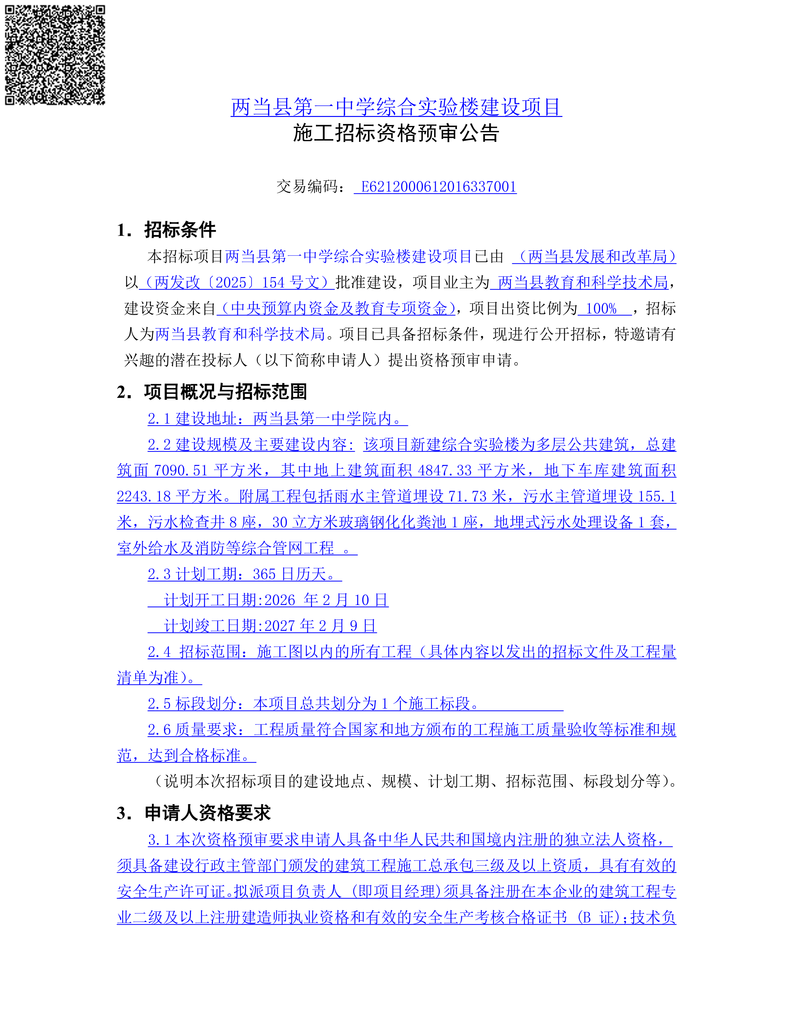 两当县第一中学综合实验楼建设项目施工招标资格预审公告