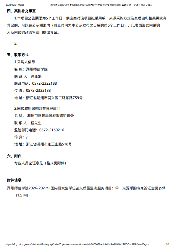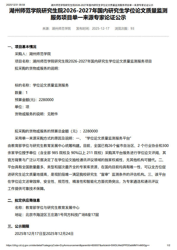 湖州师范学院研究生院2026-2027年国内研究生学位论文质量监测服务项目单一来源论证公示