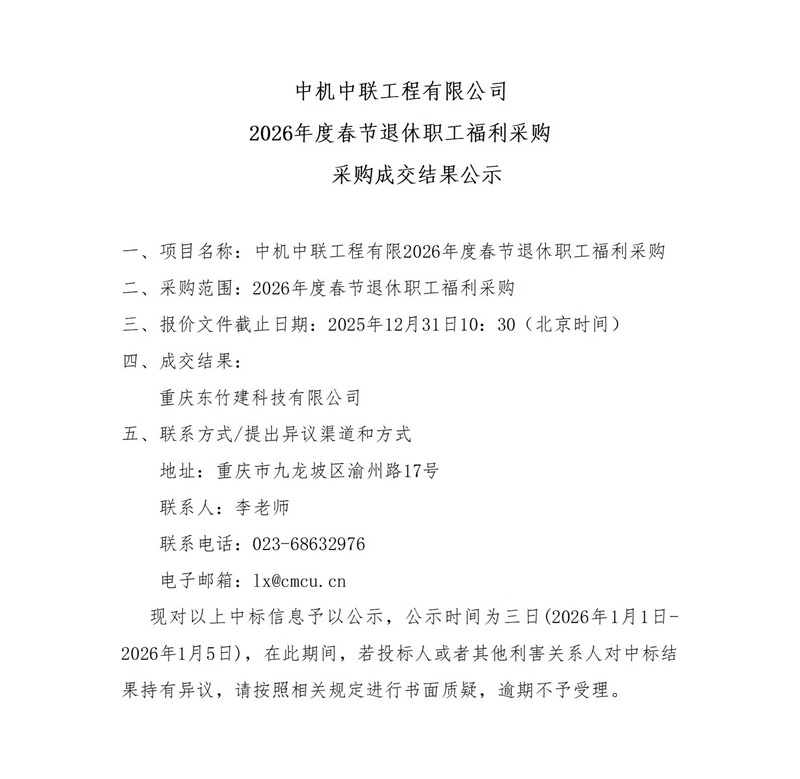 [国机集团]中机中联工程有限2026年度春节退休职工福利采购成交结果公示