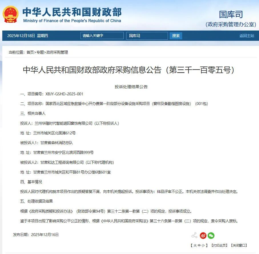 **月**日,财政部发布中华人民共和国财政部政府采购信息公告(第三千一百零五号),在国家西北区域应急救援中心开办费第一阶段部分设备设施采购项目(窗帘及备勤楼厨房设施)(***包)中,投诉人因对代理机构就本项目作出的质疑答复不满,提起投诉。投诉事项为:样品评审不公正。财政部根据《中华人民共和国政府采购法》第三十六条第一款第(二)项的规定,责令采购人废标。 ![]()