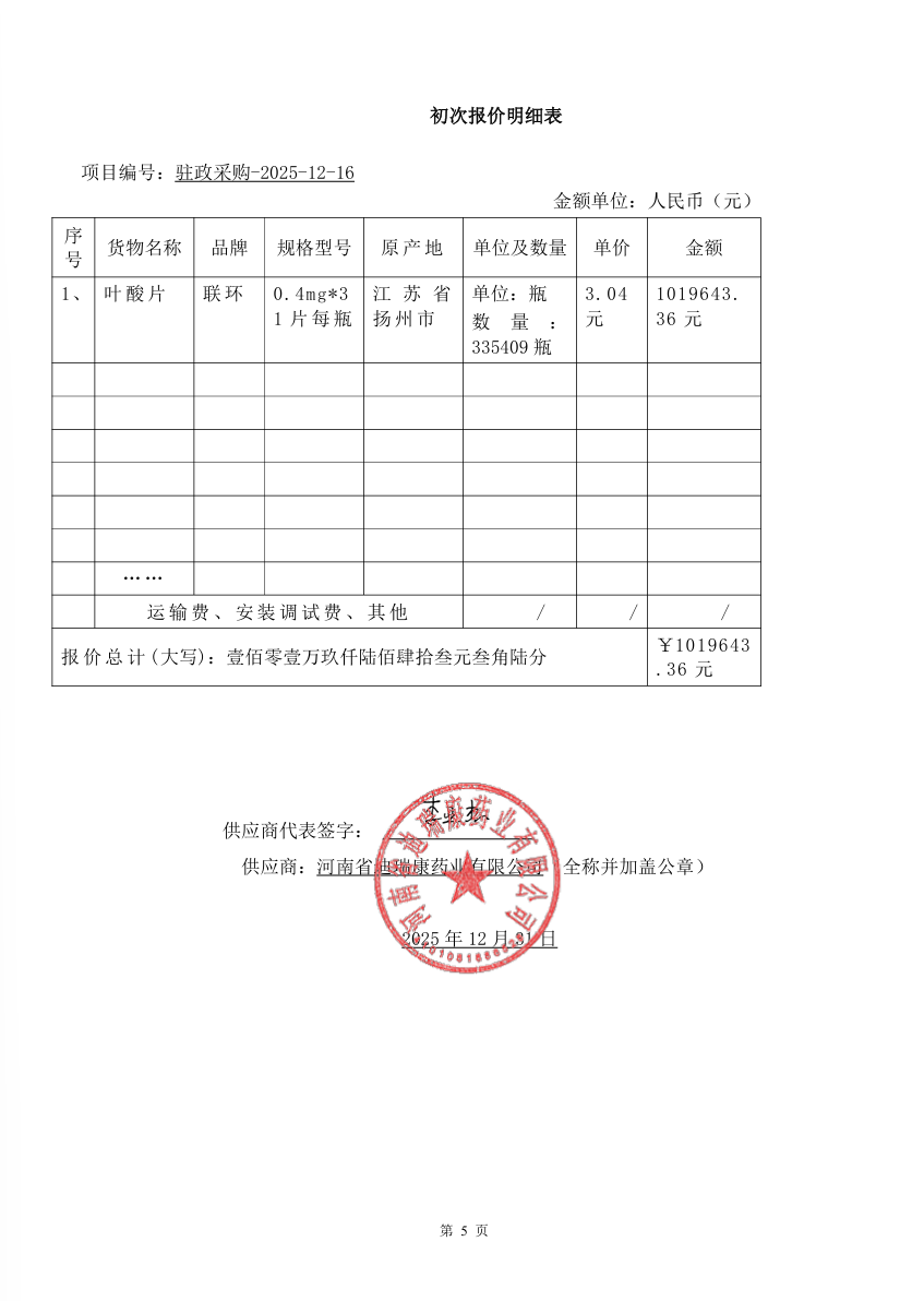 驻马店市卫生健康委员会****年增补叶酸预防神经管畸形项目*成交公告