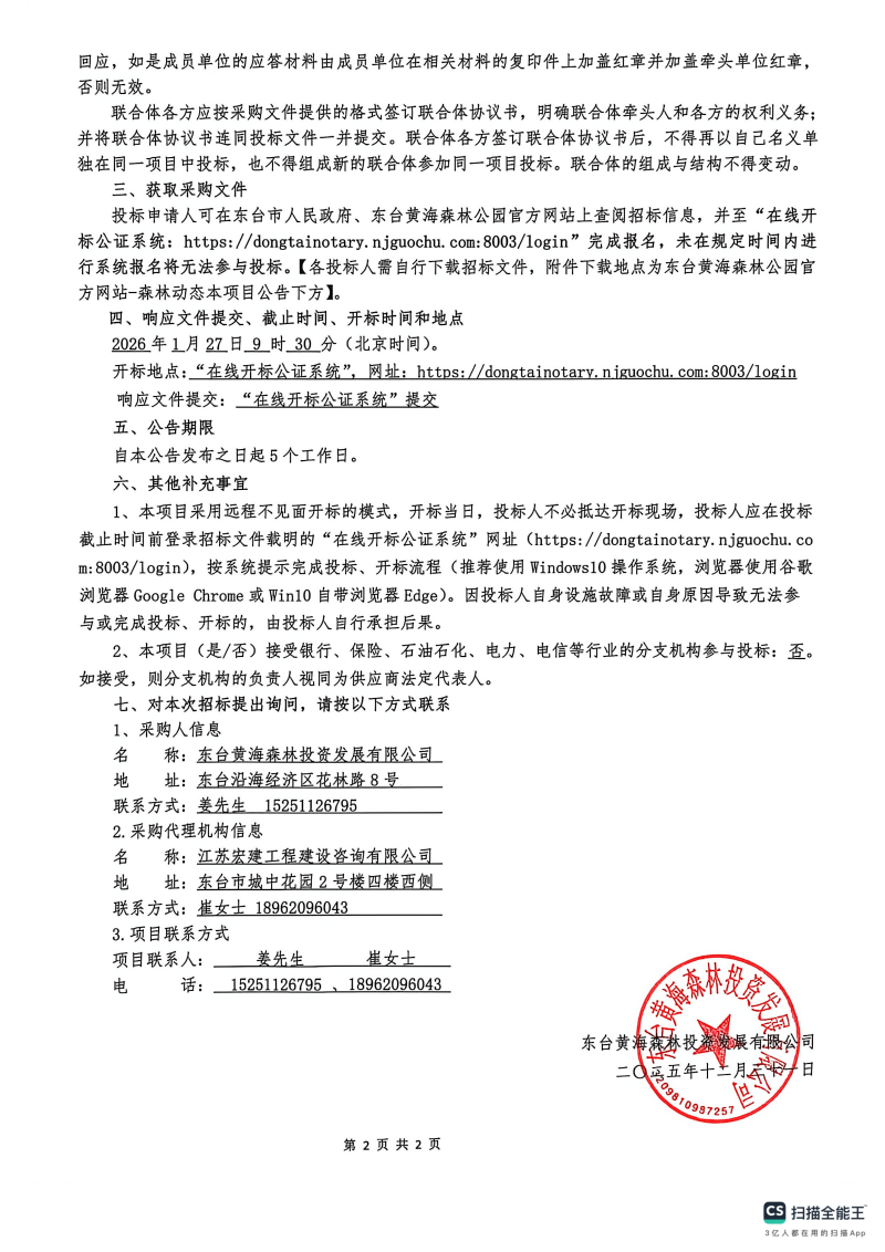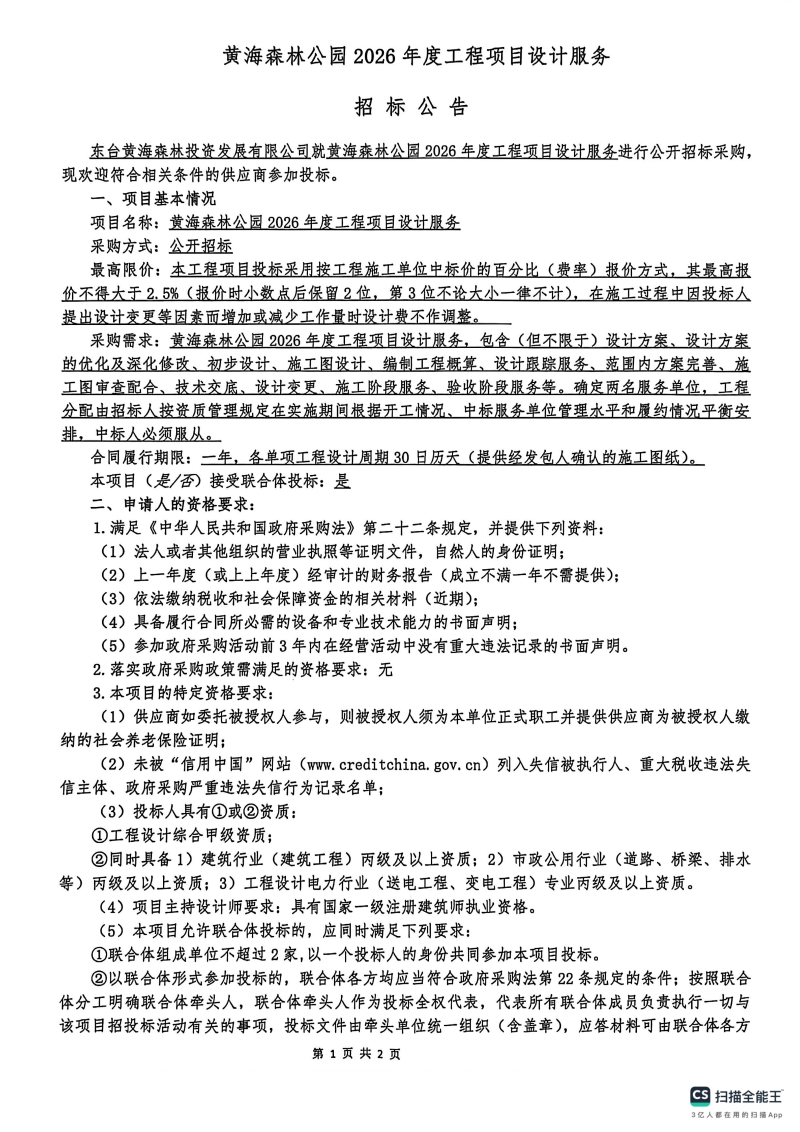 黄海森林公园2026年度工程项目设计服务招标公告