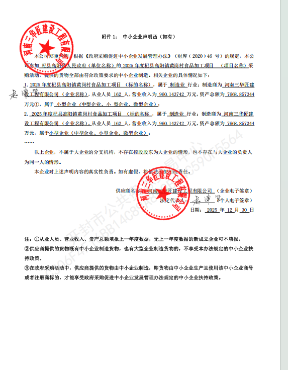 2025年度杞县高阳镇黄岗村食品加工项目中标公告