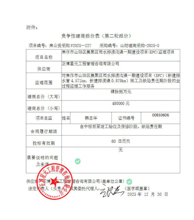 焦作市山阳区集聚区雨水排涝沟渠一期建设项目(EPC)监理项目成交结果公告