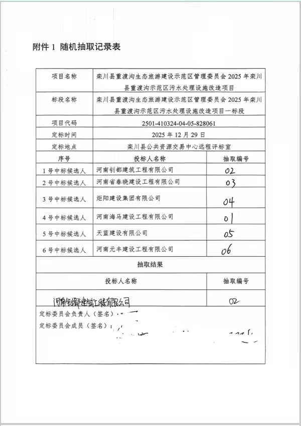 河南沃馀工程咨询有限公司受栾川县重渡沟生态旅游建设示范区管理委员会委托,就栾川县重渡沟生态旅游建设示范区管理委员会****年栾川县重渡沟示范区污水处理设施改造项目进行公开招标,按规定程序进行了开、评标、中标候选人公示、定标流程,现就本次招标的中标结果公布如下: