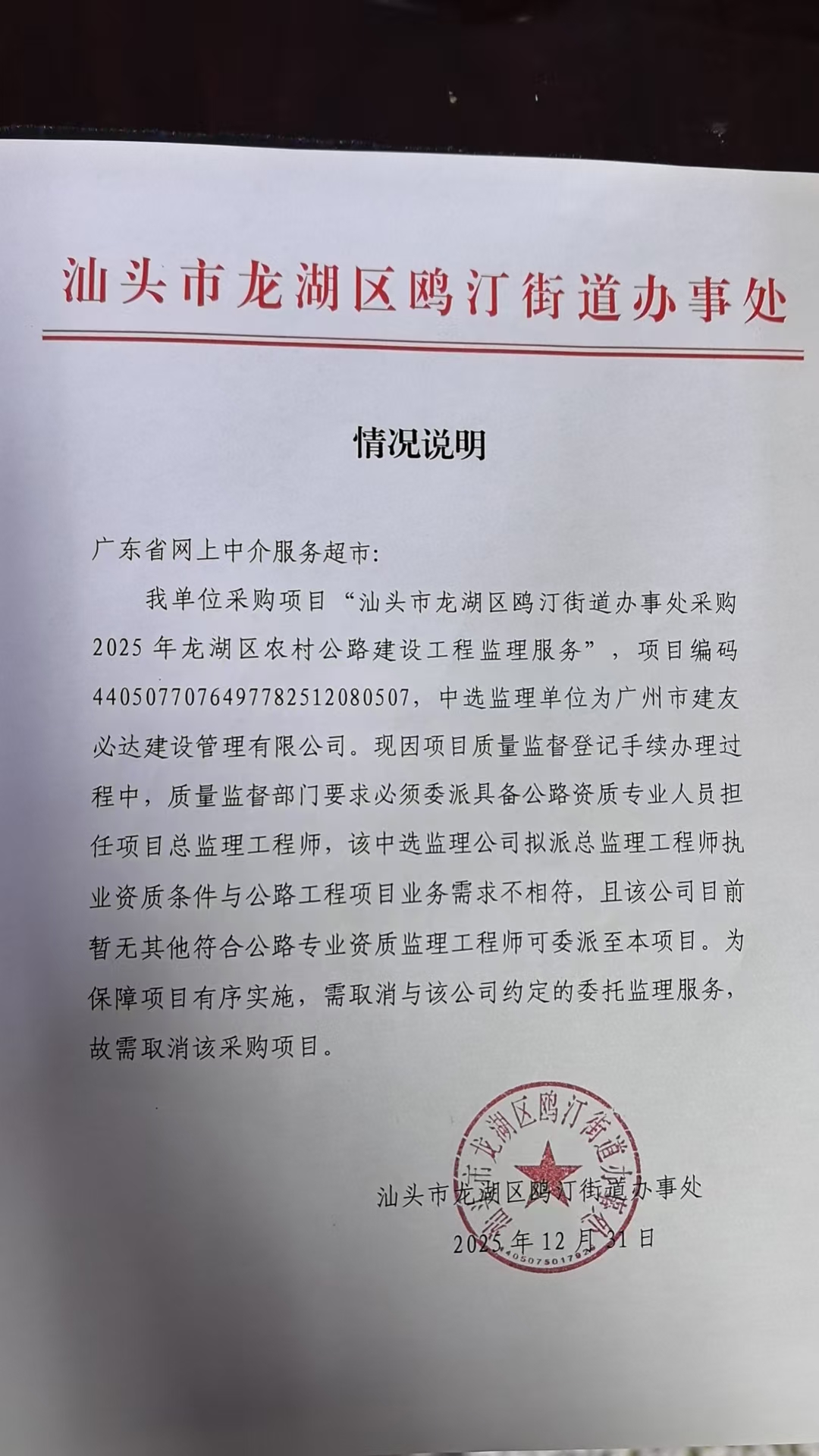 汕头市龙湖区鸥汀街道办事处采购2025年龙湖区农村公路建设工程监理服务采购失败项目公示