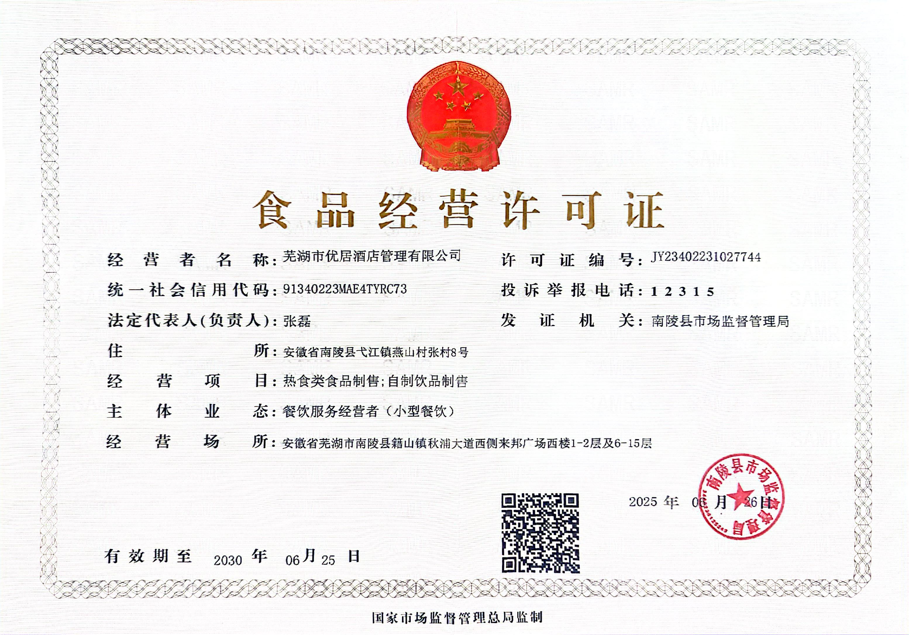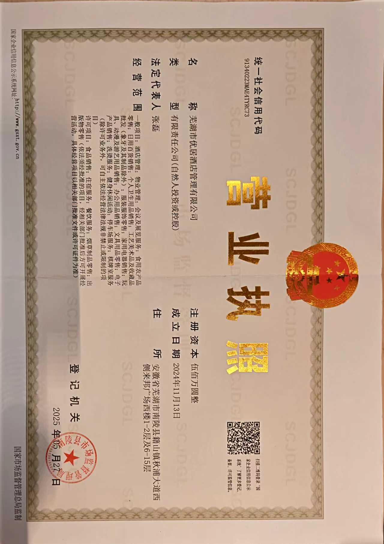 供应商名称:芜湖市优居酒店管理有限公司