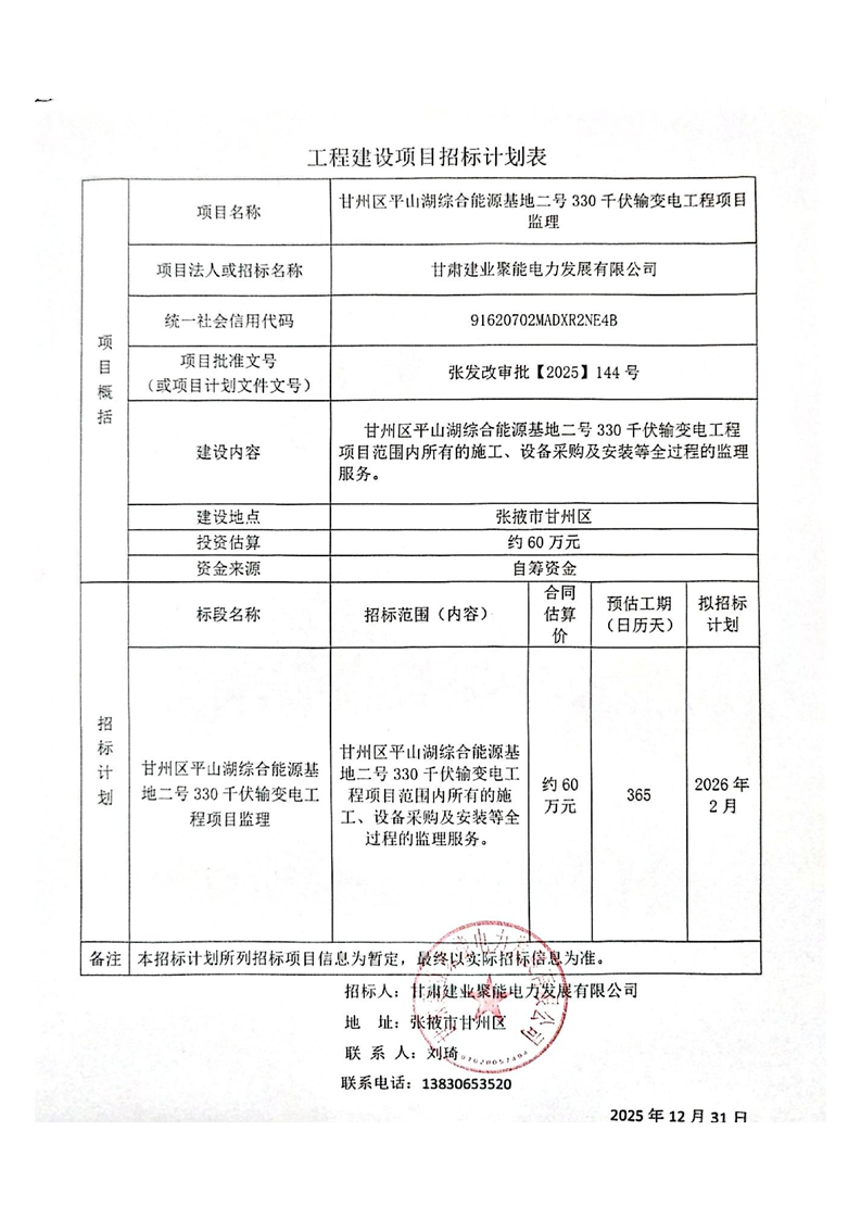 甘州区平山湖综合能源基地二号330千伏输变电工程项目监理招标计划