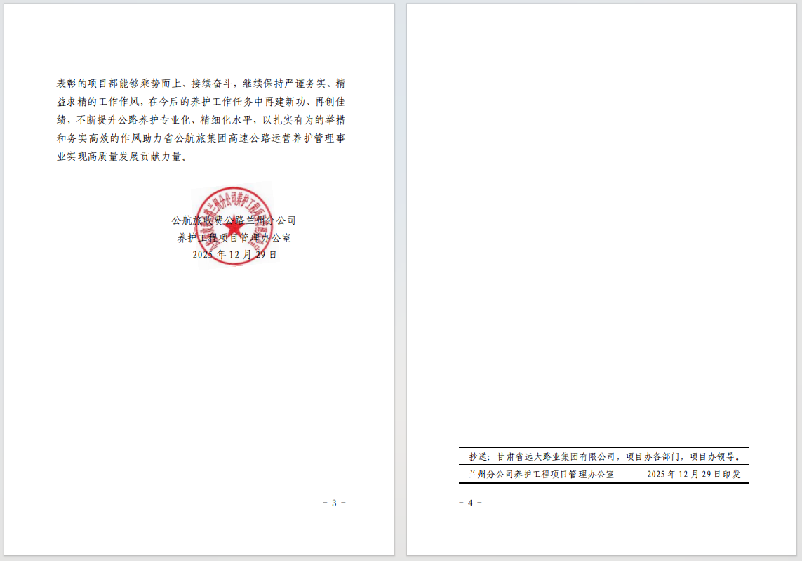 **月**日,远大公司****年养护工程项目经理部(第一、三、八分部)喜获甘肃公航旅收费公路兰州分公司养护工程项目管理办公室通报表扬。兰州分公司项目办对第一、三、八分部在****年修复、预防性养护工程中的突出业绩与责任担当予以高度肯定。这既是对三大分部攻坚克难、精益求精的专业认可,更是对远大公司转型发展元年深耕养护主业、交出高质量答卷的有力佐证,生动彰显了国企转型路上的责任底色与硬核实力。