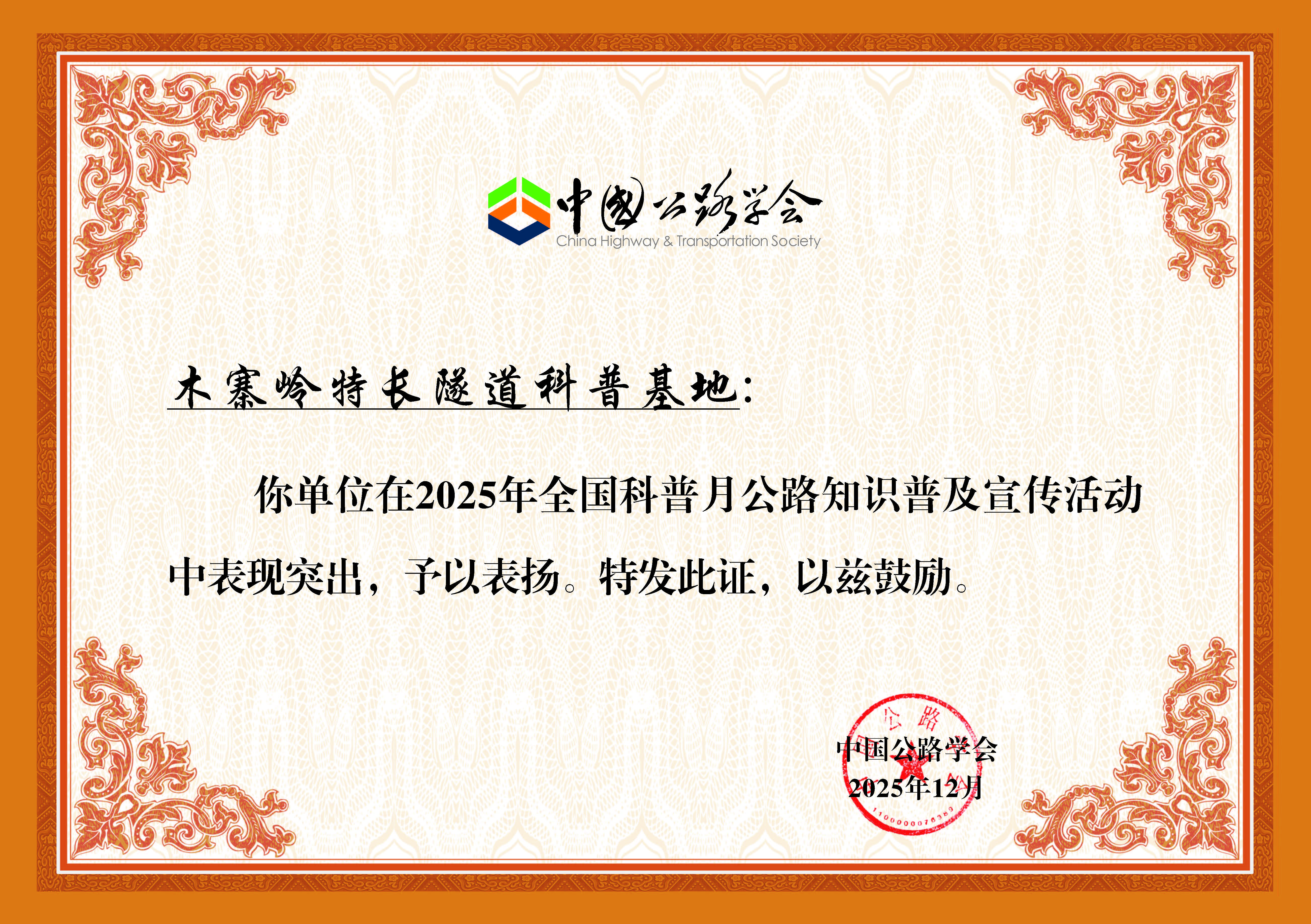 木寨岭特长隧道科普基地在全国科普月活动中获中国公路学会表彰