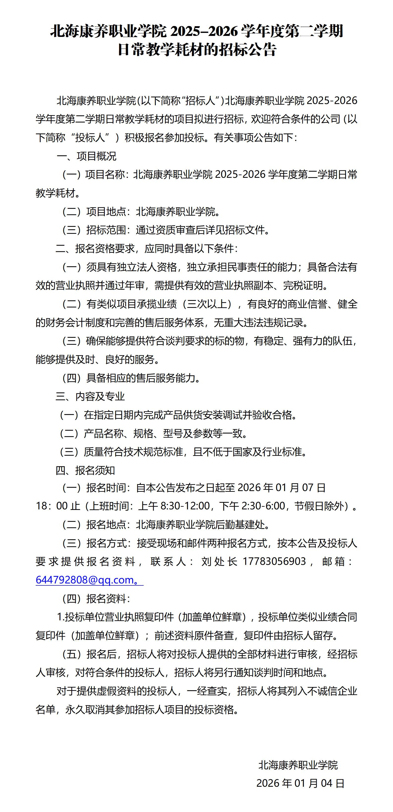 北海康养职业学院2025-2026学年度第二学期日常教学耗材的招标公告