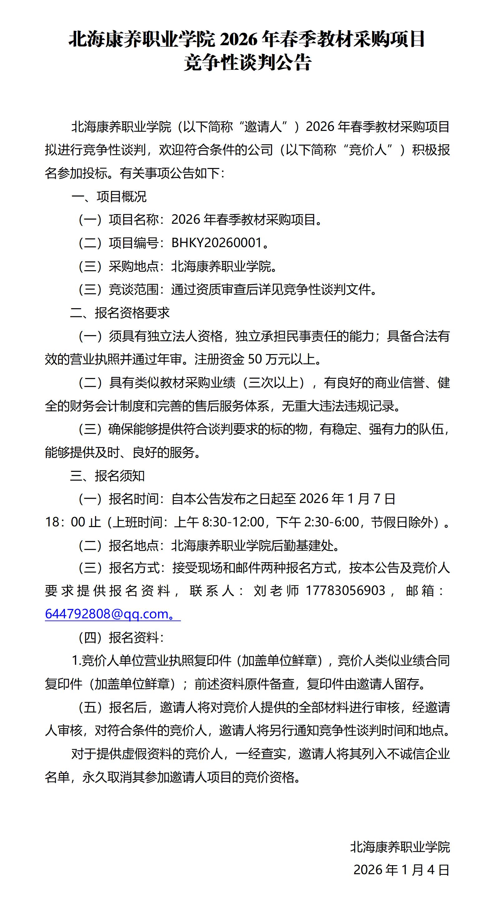 北海康养职业学院2026年春季教材采购项目竞争性谈判公告
