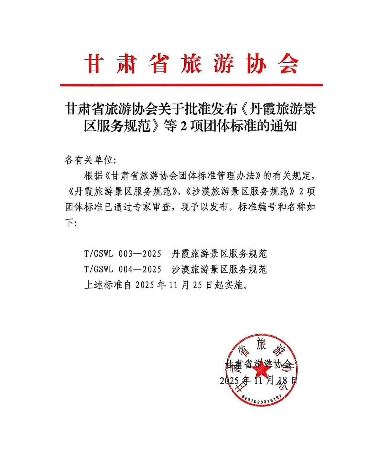 近日,甘肃省旅游协会正式批准发布《丹霞旅游景区服务规范》团体标准。该标准由省公航旅集团张掖丹霞文化旅游股份有限公司(以下简称“张掖丹霞公司”)作为主要发起单位和牵头起草单位,联合省内相关科研机构、高校及同业单位共同编制完成,旨在为丹霞地貌类旅游景区的服务提供科学、统一、规范的指引,标志着甘肃省在特色旅游资源服务标准化建设方面迈出了关键一步。