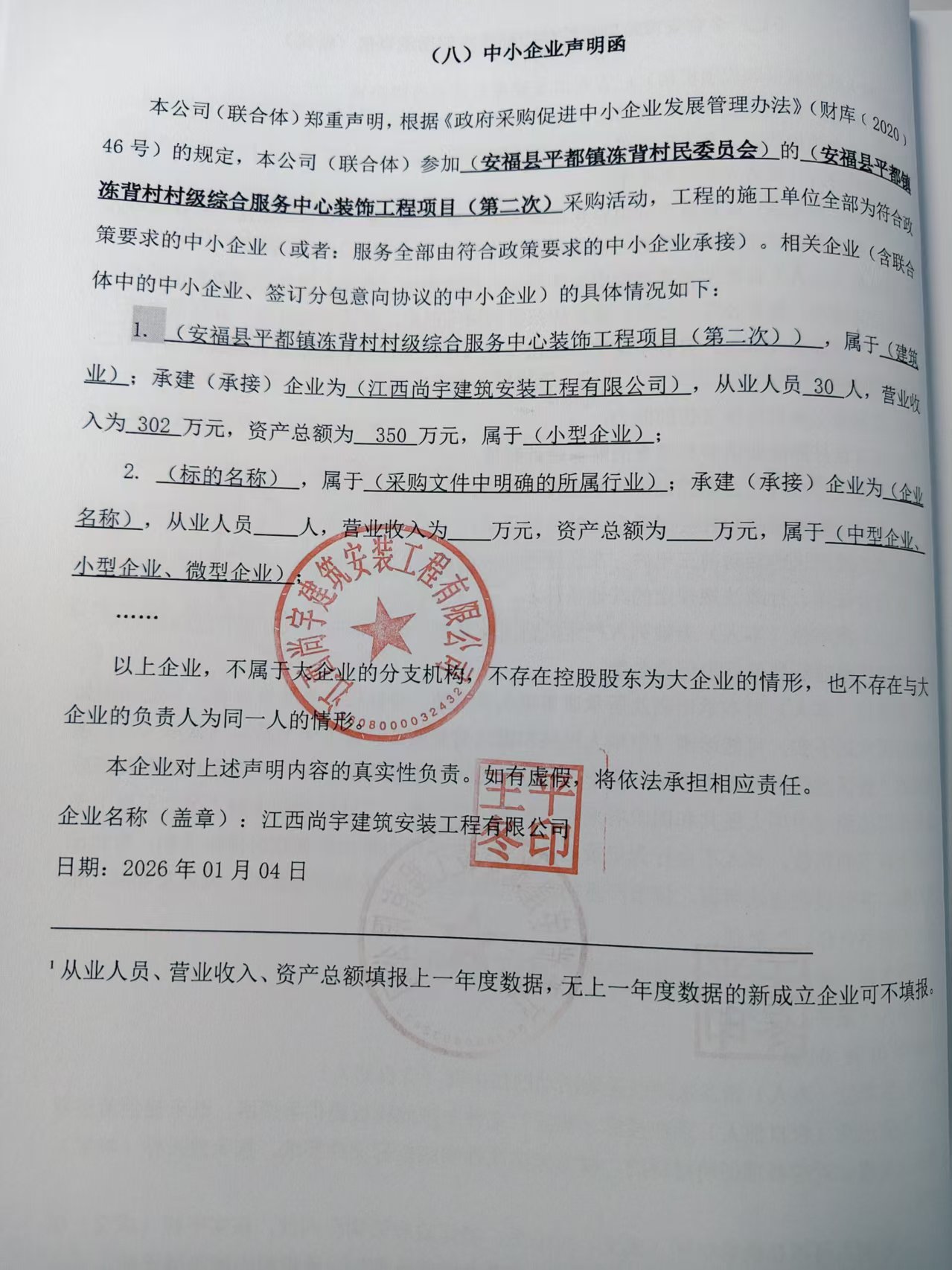 * | 江西尚宇建筑安装工程有限公司 | 安福县平都镇冻背村村级综合服务中心装饰工程项目(第二次) | 详见采购文件。 | 合同签订后**个月内完工。 |