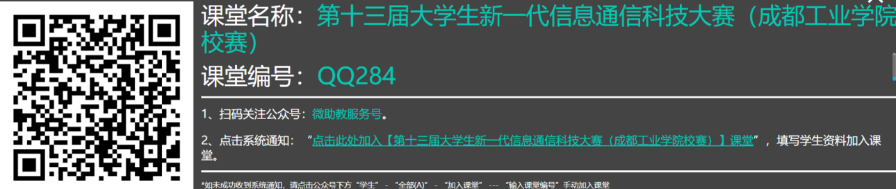 *.网通学院参赛同学均需加入微助教课程第十三届大学生新一代信息通信科技大赛中(二维码见下) 和**交流群。加入课程时,务必以“年级*专业*姓名”(如**通信张三) 来命名。