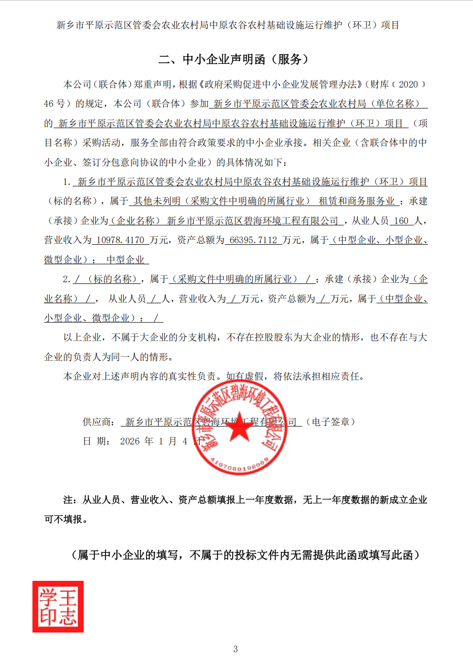 新乡市平原示范区管委会农业农村局中原农谷农村基础设施运行维护(环卫)项目*中标公告