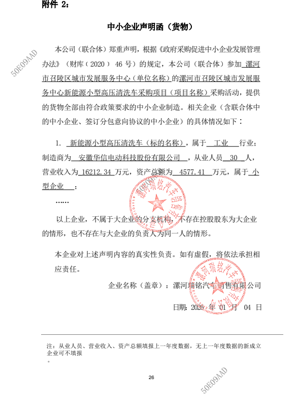 | *、采购项目名称:漯河市召陵区城市发展服务中心新能源小型高压清洗车采购项目 | |||||||||||||||||||||||||||||||