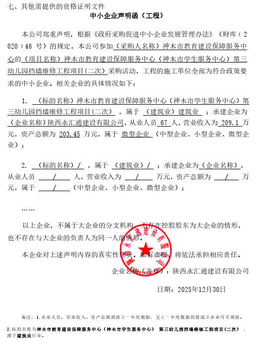 神木市教育建设保障服务中心(神木市学生服务中心)第三幼儿园挡墙维修工程(二次)中标(成交)结果公告