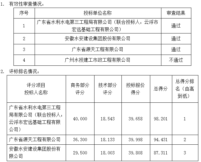 第一中标候选人 | 广东省水利水电第三工程局有限公司(联合投标人:云浮市宏远基础工程有限公司) |