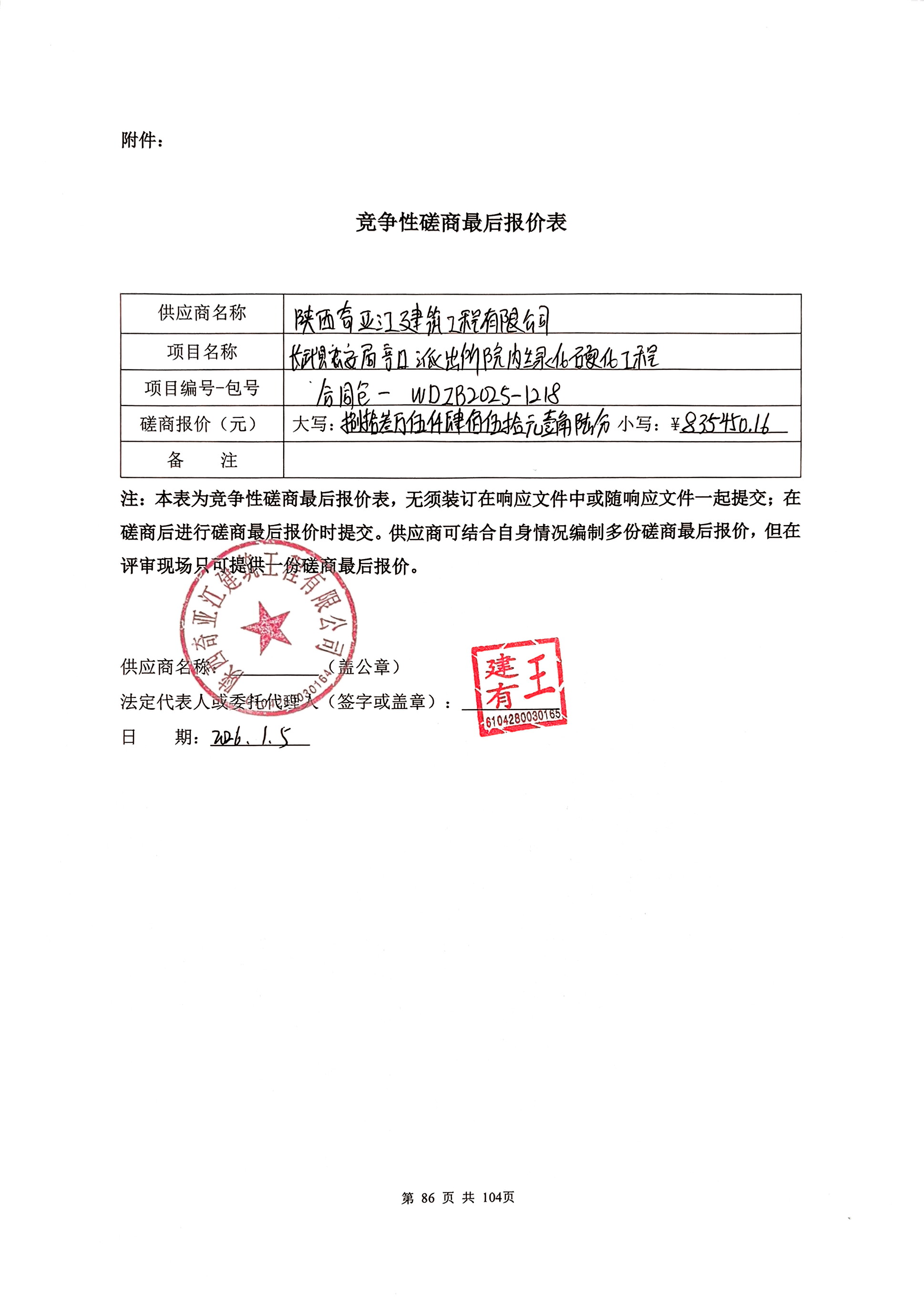 | * | 其他专业施工 | 长武县公安局亭口派出所院内绿化硬化工程 | 本项目施工图纸、磋商文件及工程量清单的全部内容。 | 合同签订后**个日历天 | 徐财立 | 项目经理注册证编号:陕************ | ***,***.** |