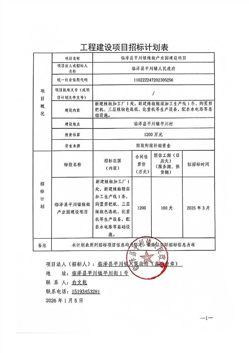 临泽县平川镇辣椒产业园建设项目招标计划