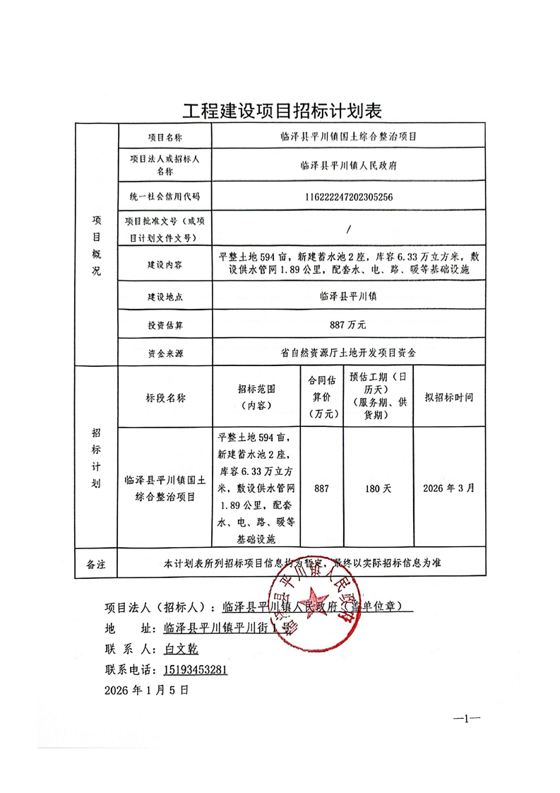 | 招标项目名称 | 临泽县平川镇国土综合整治项目 | ||
