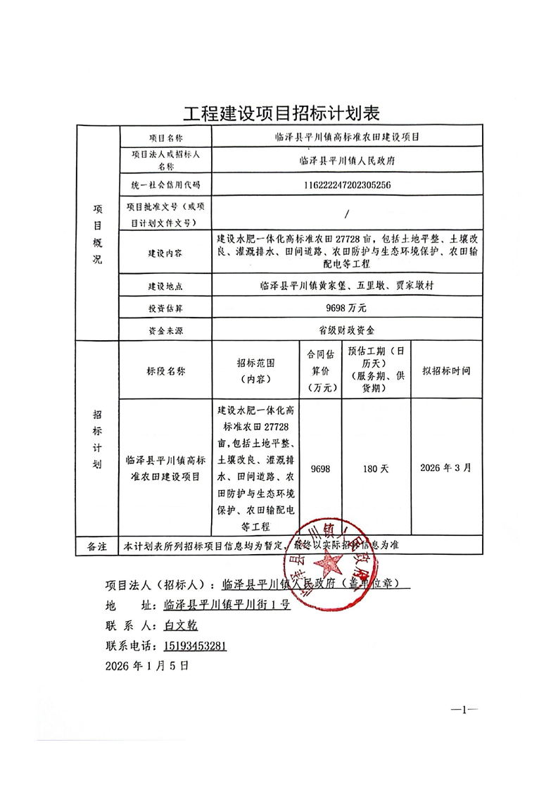 临泽县平川镇高标准农田建设项目招标计划
